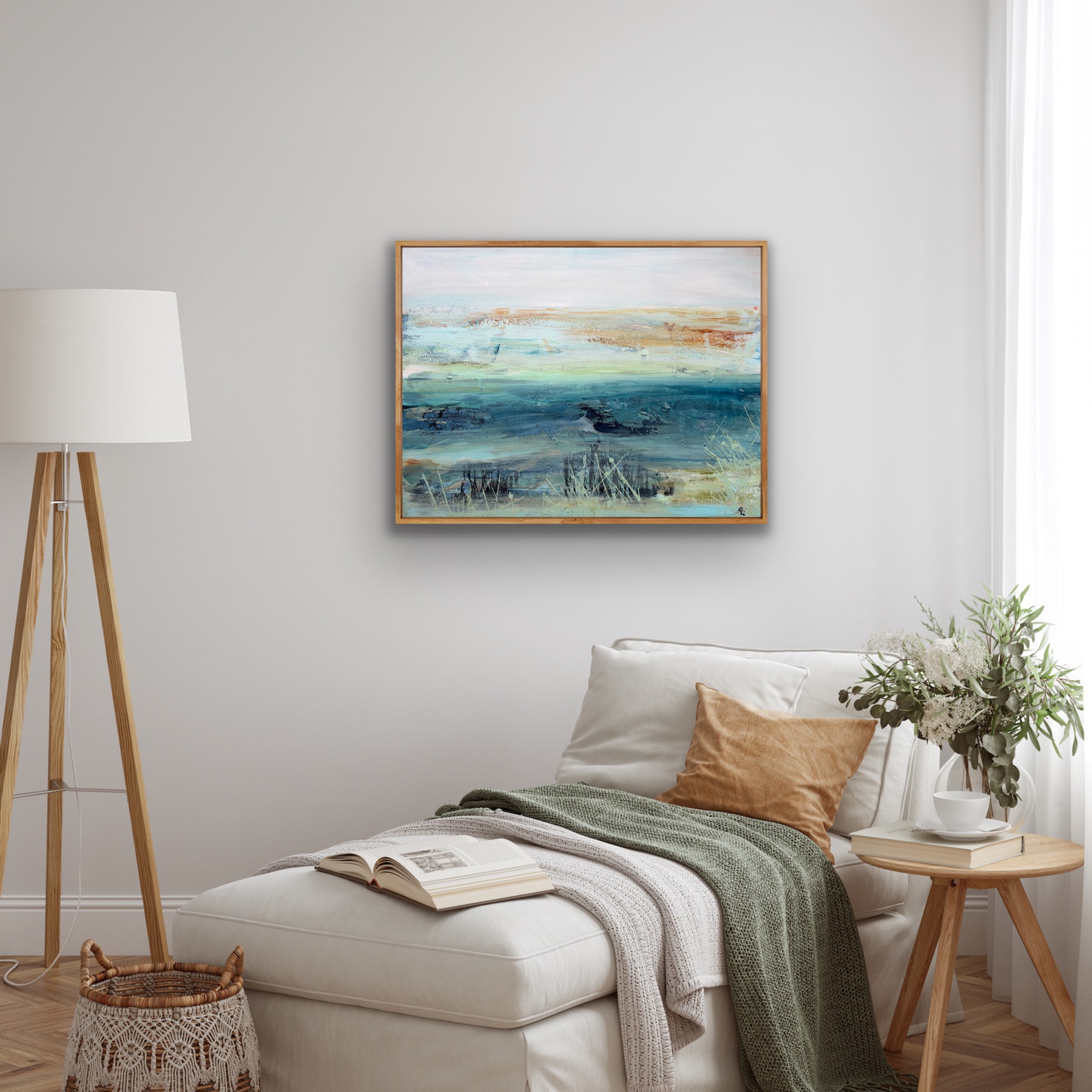 Abstrakt landskab 80 x 60 med egetræsramme